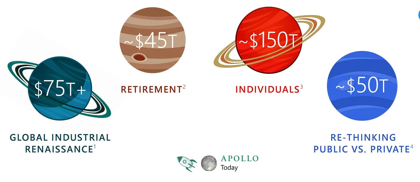 But this is not all. A lot of new private assets will be needed to fund infrastructure, renewables, retirement, etc. On the slide from Apollo below, you can see an estimate of private assets that may be needed for these purposes.