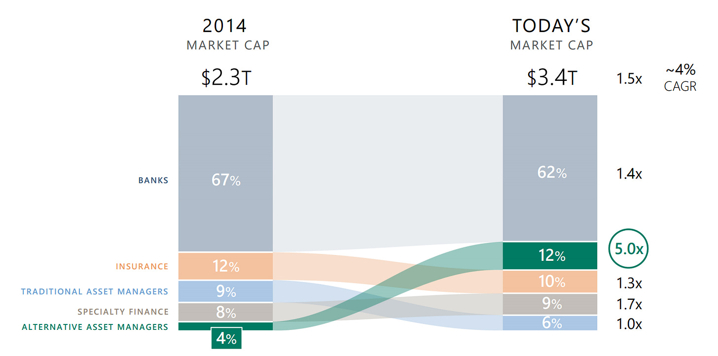 In 2014, alt managers constituted 4% of $2.3T of financial services capitalization. Today it is 12% of a $3.4T pie. It means 5.0x grows in absolute figures!