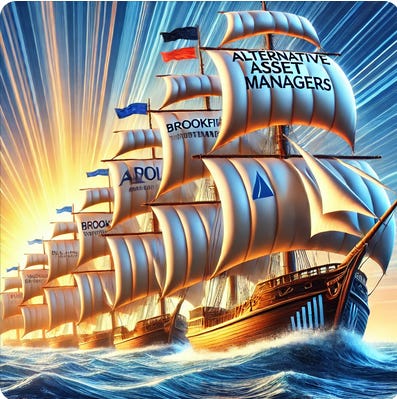 Working with affiliated insurers has become a major trend among alt managers, inspired largely by Apollo’s success. The concept is straightforward: certain life insurance products, like fixed annuities, have long-term payout horizons, allowing insurers to hold funds for years. This makes annuities ideal for funding private credit, and it’s a model that has proven highly effective for both Apollo and KKR. Both of them as well as Brookfield house gigantic life insurance subsidiaries.