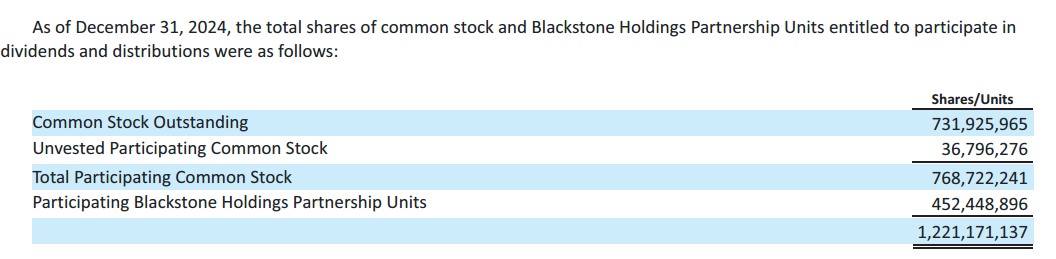 Blackstone operations are owned by both Blackstone, Inc. (the one trading on NYSE as BX) and the Blackstone Holding Partnership, with units exchangeable on a one-to-one basis to BX shares (both groups are equally eligible for dividends/distributions). The unitholders consist of management, employees, and some third parties. Every year (since 2019 when Blackstone was converted into a corporation from a partnership), some units are being converted into shares, but new units are being issued to certain newly hired and pre-existing senior managing directors. This process is not very transparent, but currently, about 63% of owners consist of shareholders and 37% of unitholders. In 2023, shareholders represented 59% of owners. For better understanding, here is an excerpt from the 10-K: