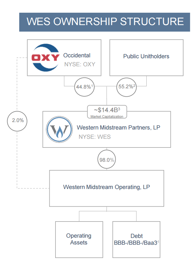 Occidental Petroleum’s (OXY) controls WES through the combinations of GP and LP units as in the picture below from WES’s filings: